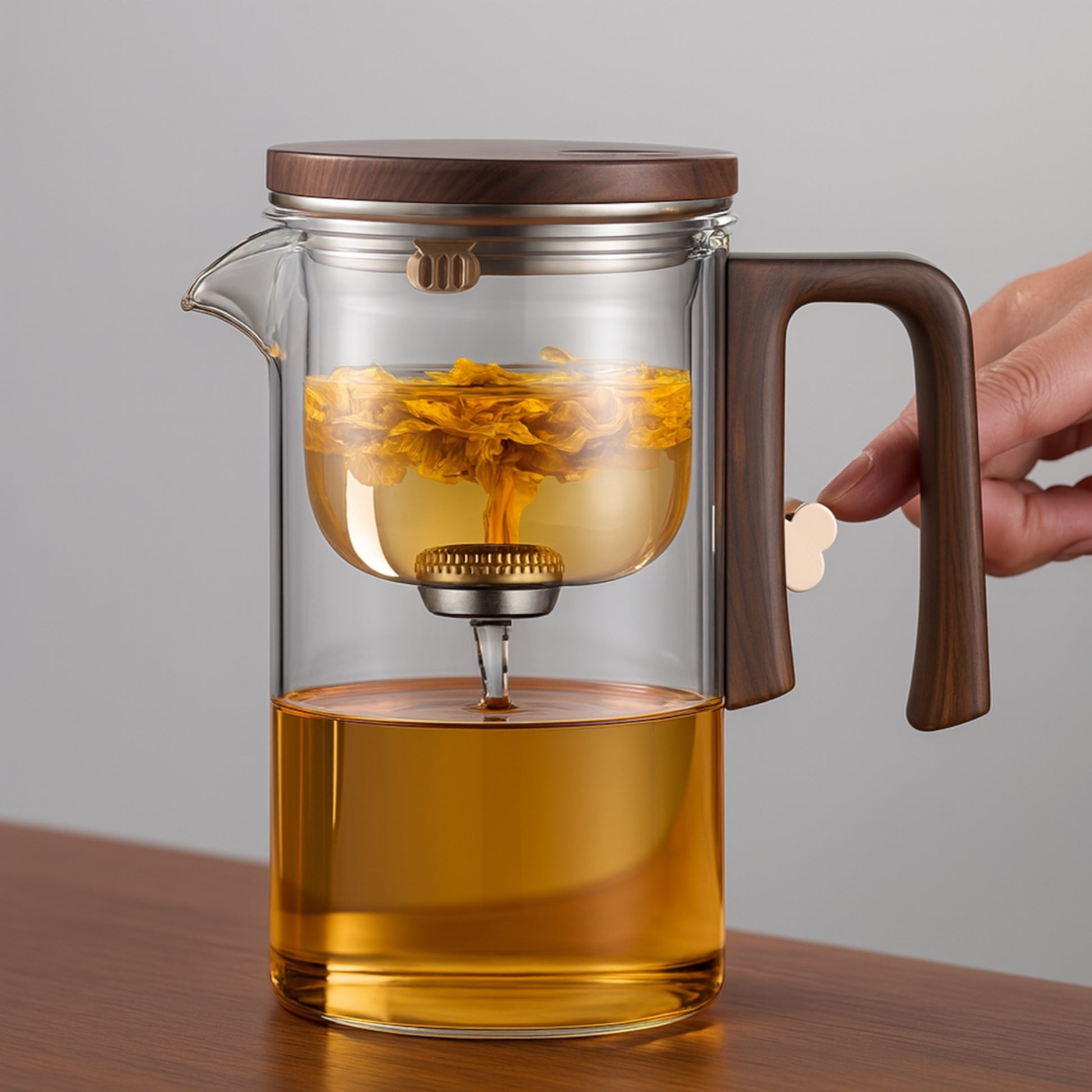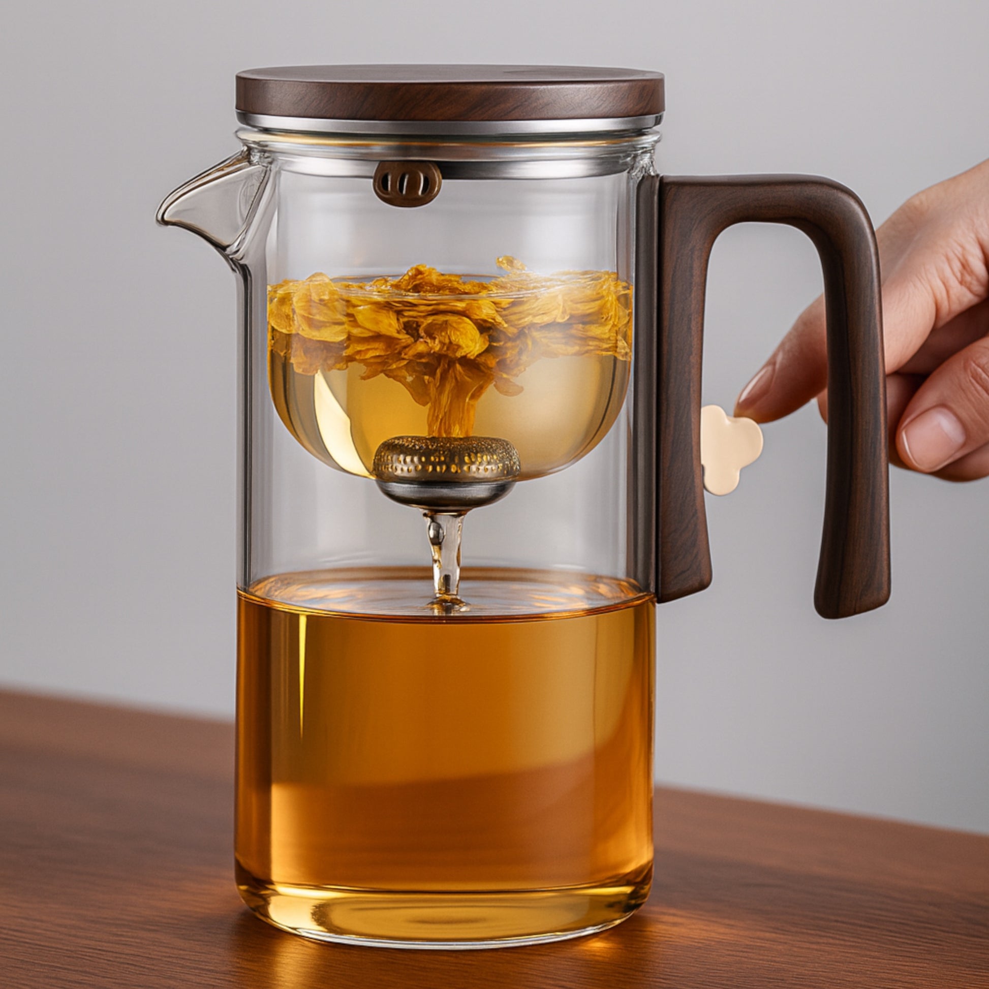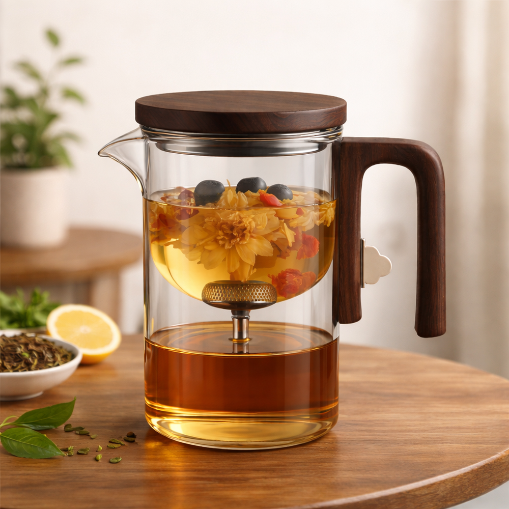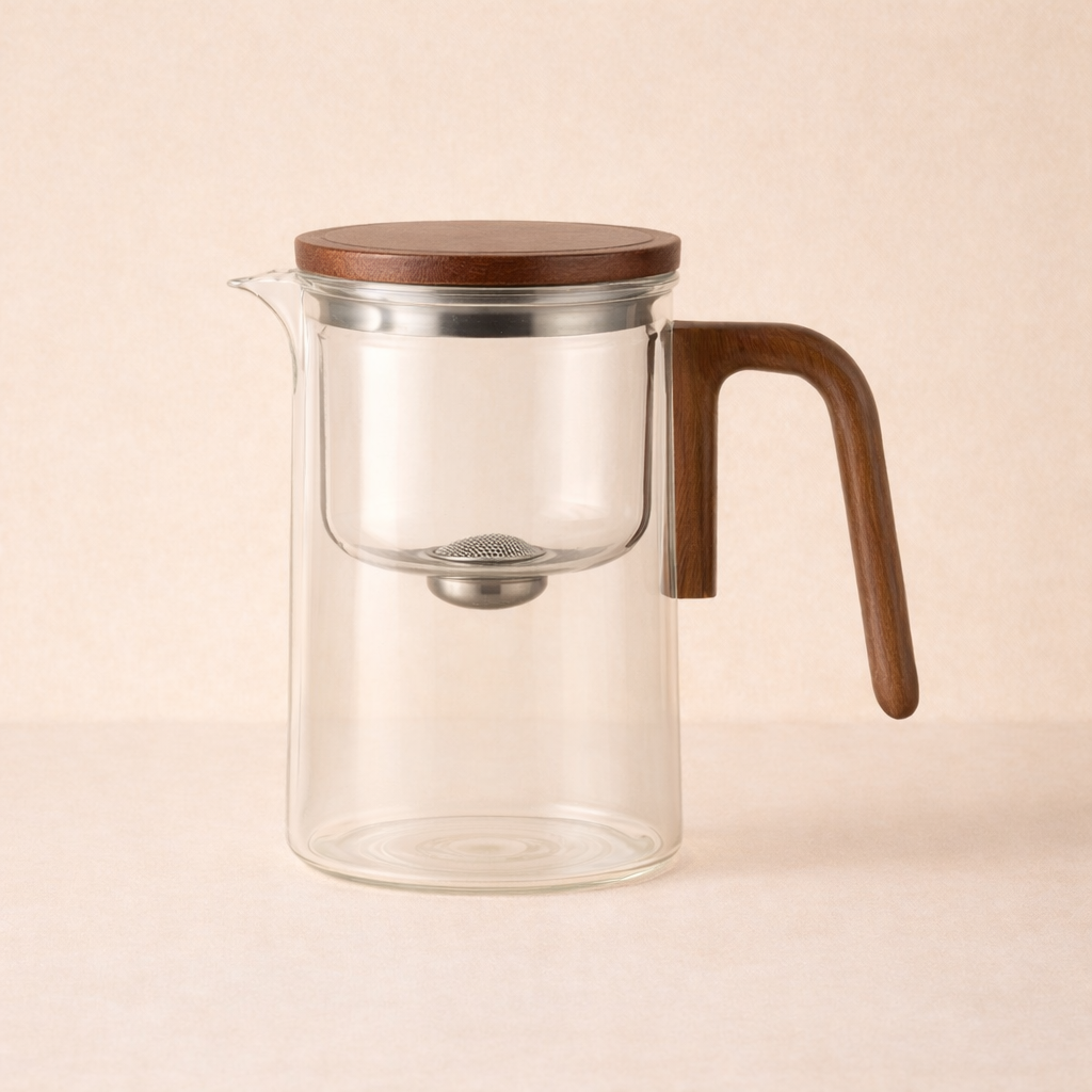 Während die Teeblätter im oberen Glasraum ziehen, bleibt der Tee klar und ruhig.